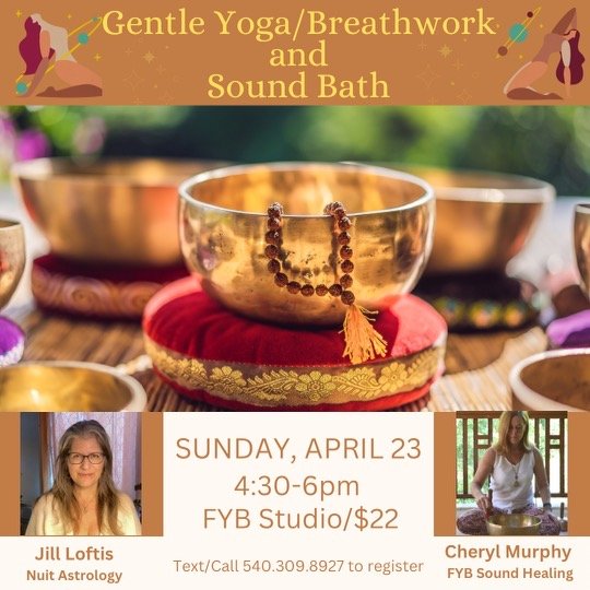 Super excited for this in-person yoga, breathwork and sound healing experience! Located in the Blue Ridge Mountains of Virginia (near Roanoke, VA) join me at FYB Sound Healing space with the amazing Cheryl Murphy on Sunday, April 23 from 4:30 to 6:00 pm for gentle yoga, purifying breathwork and healing sound.